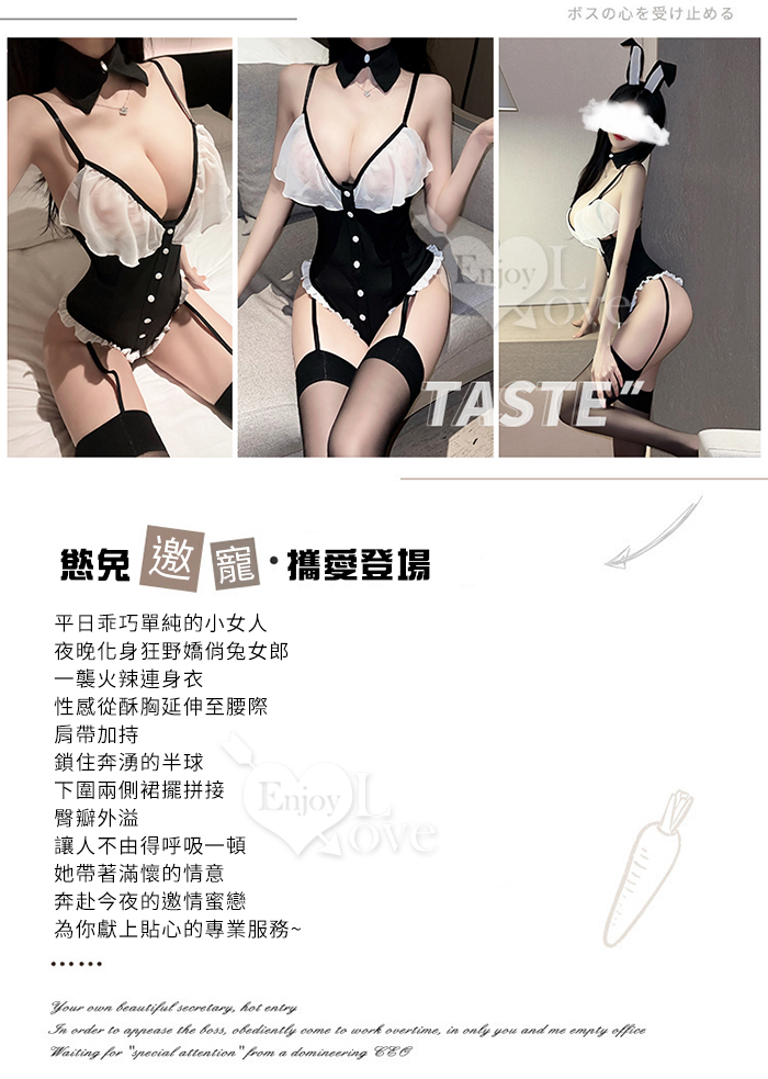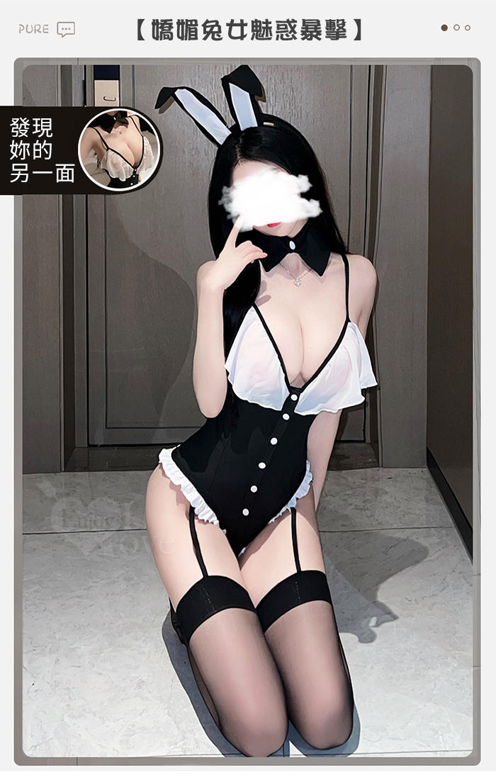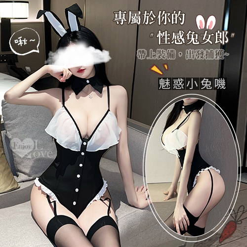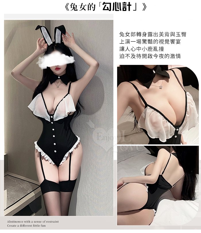 兔女郎荷葉邊低領透胸可開襠連身衣吊襪帶四件式套裝