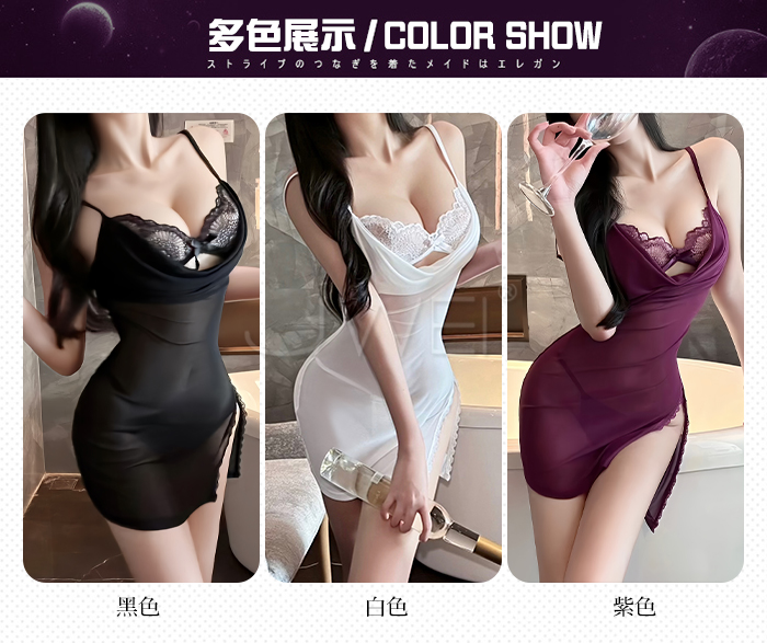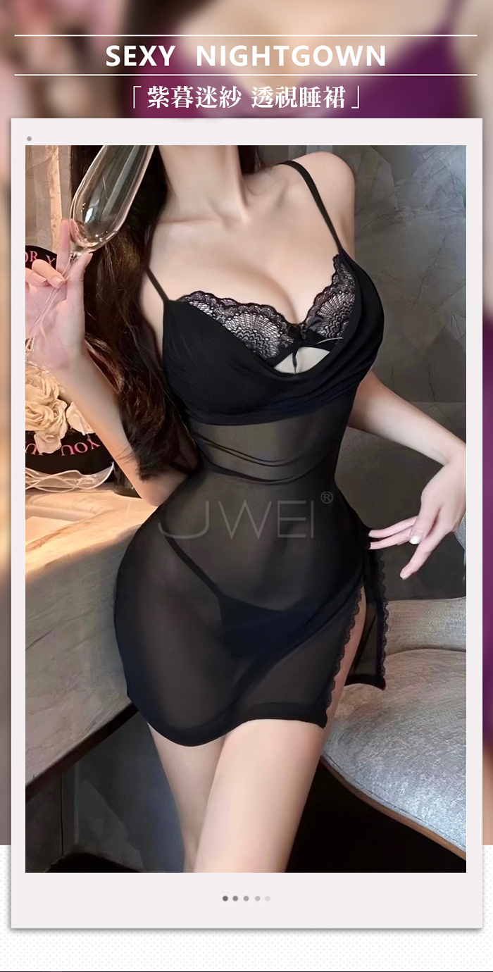 首頁 / 月暮迷紗.性感裸紗蕩領透視側開衩細肩帶美背睡裙【睡裙+T褲-黑色】