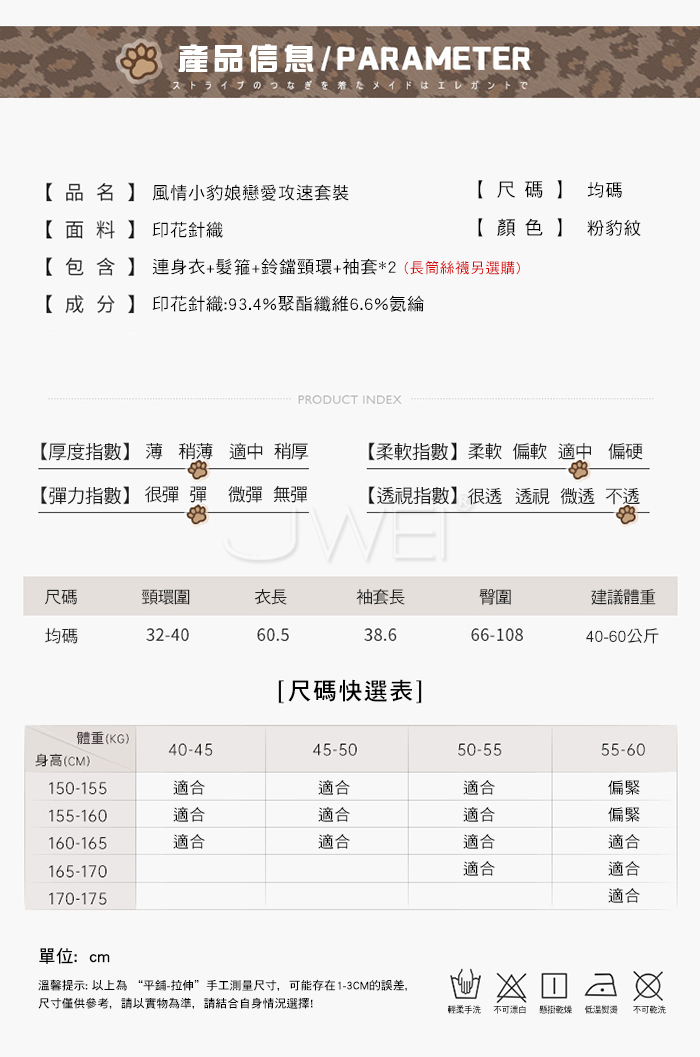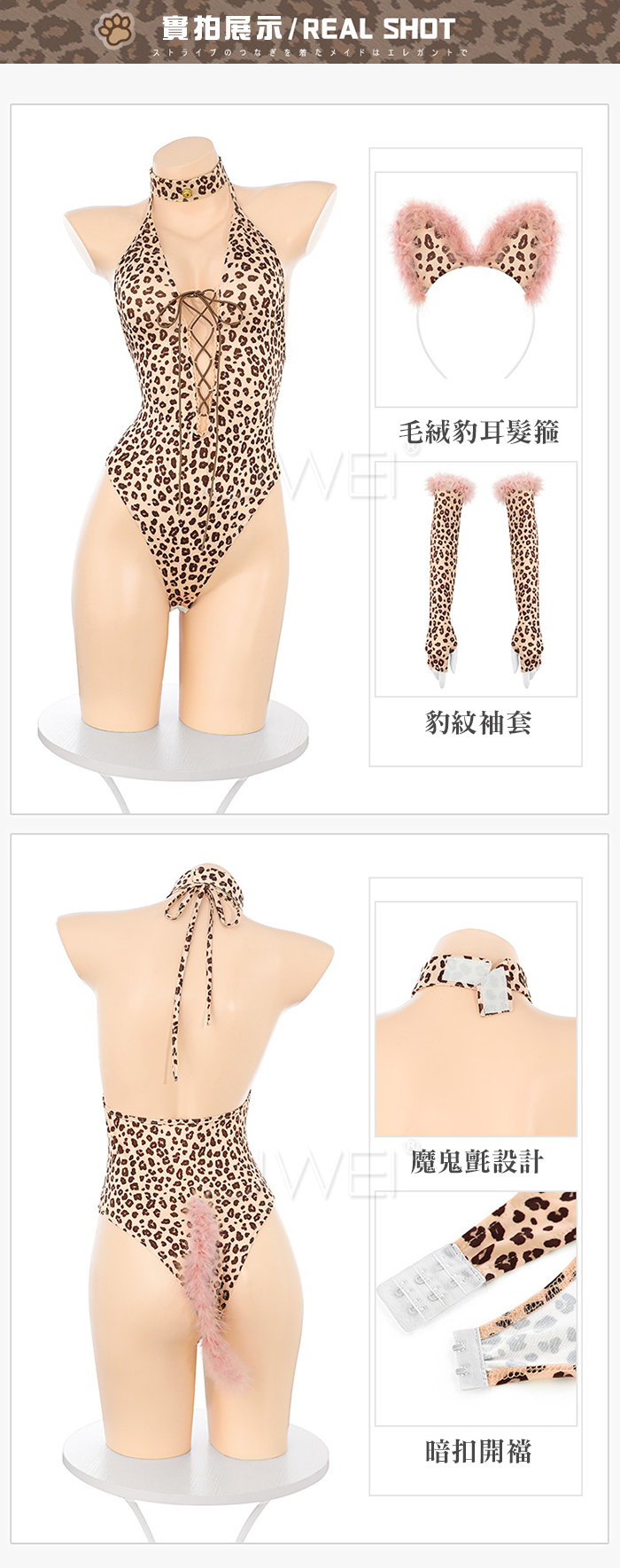 首頁 / 風情豹娘.豹紋大深V繫帶露溝美背暗釦開襠連身衣【髮箍+鈴鐺頸環+袖套*2+連身衣】