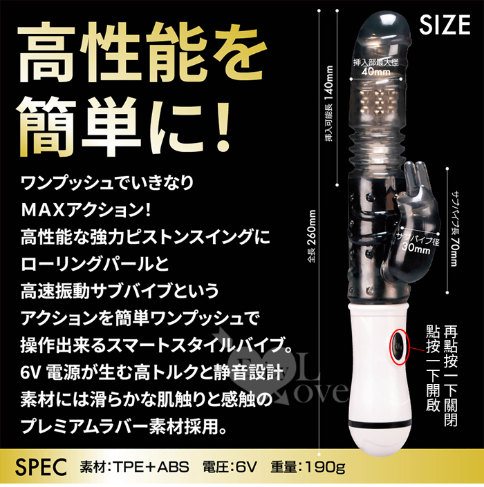 1回押すだけで瞬時にMAXアクションを実現する6V電源により高トルクを発生します。 高品質のゴム素材を採用し、静音設計、防水設計、滑らかな手触りです。