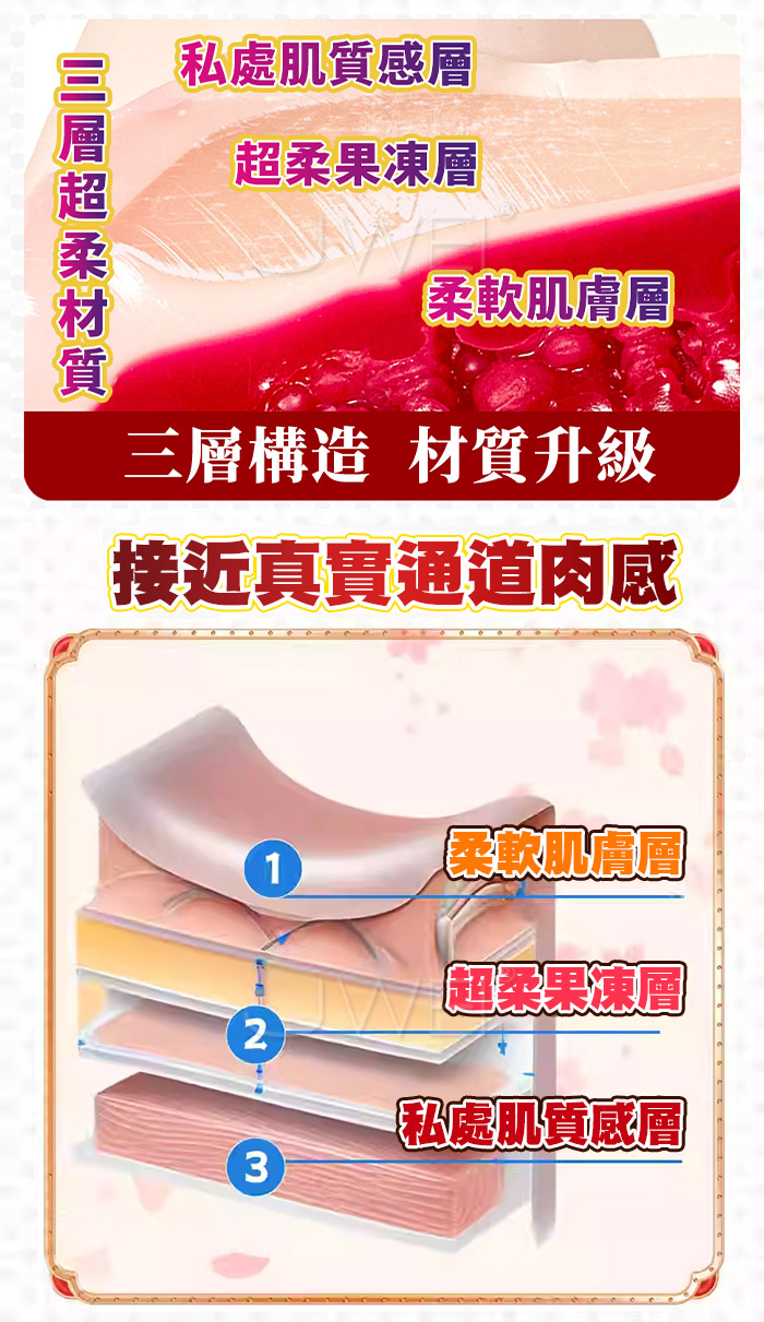 首先用仿真肌膚加工出觸感舒適的表面,裡面用彈性豐富的果凍材質做出豪華肉厚部分。