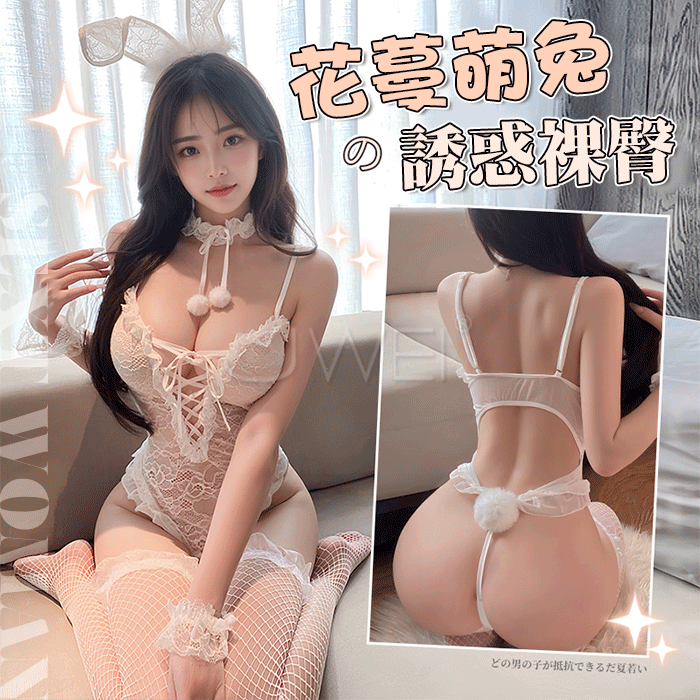花蔓萌兔.深V綁帶露溝 萌兔蕾絲半透露背連體套裝-白色【兔耳髮箍+毛球頸環+連體衣+手環*2+白花邊網襪】