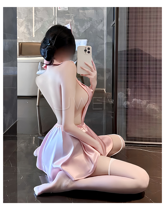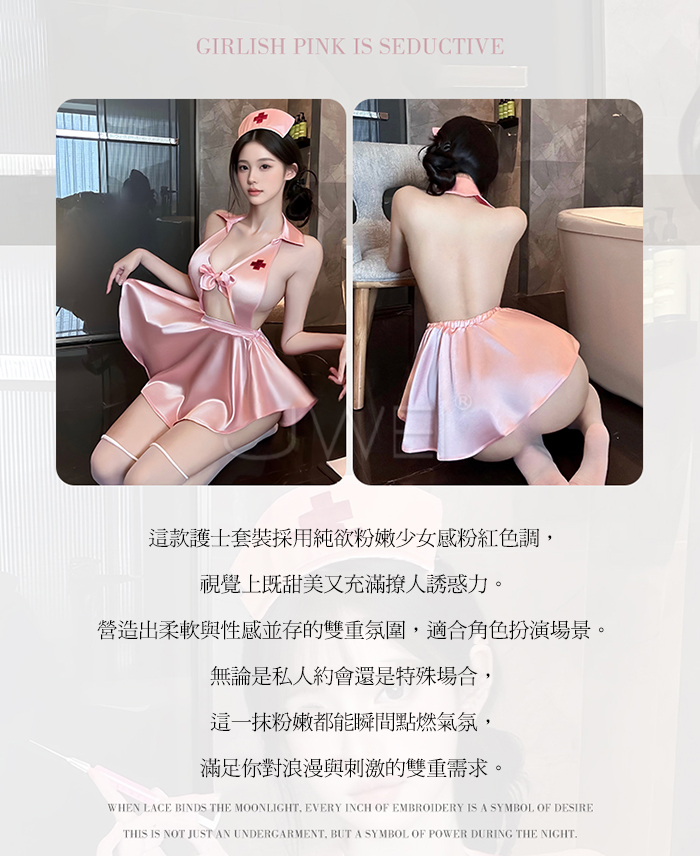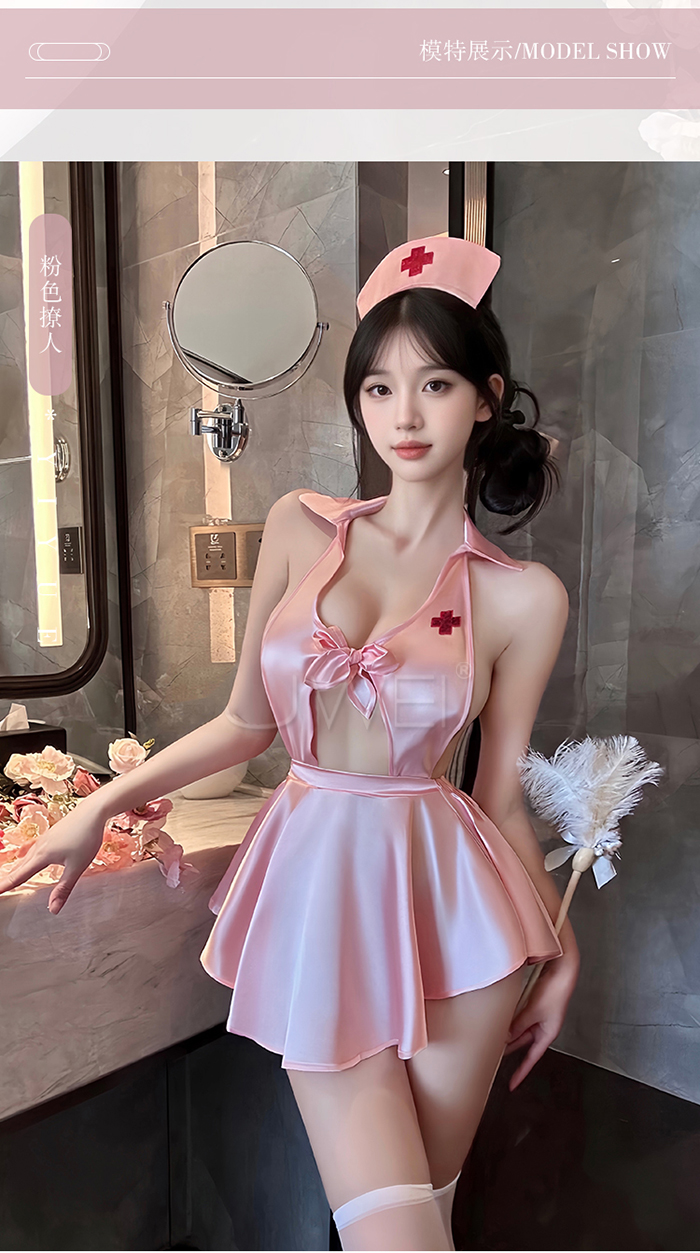 首頁 / 蜜糖護誘.粉嫩甜美深V露溝高腰短百褶裙擺護士裝【髮箍+洋裝+T褲】