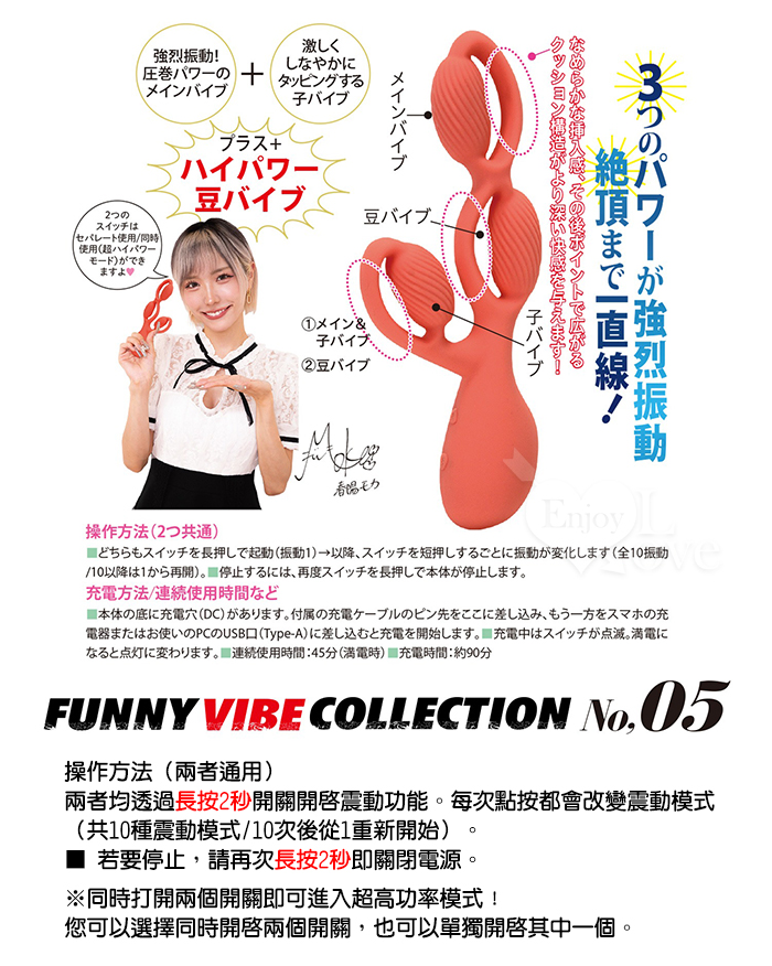 セパレート/両方同時の使い分けができ、特に豆バイブはイカせどきの使用が効果的です。 また各バイブにクッション部を加え、形状による快感と振動の刺激をより活かす設計となっています。