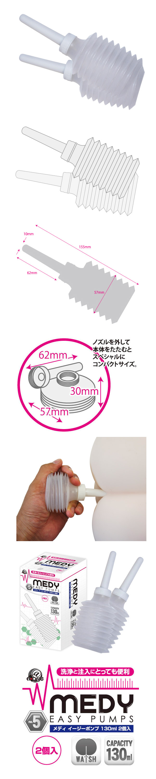 洗浄と注入にとっても便利なジャバラ式の簡易洗浄器「MEDY(メディ) no.5 イージーポンプ 130ml 2個入」。 使いやすいのでとっても手軽な使用感で、お手頃なので初心者の方の入門用としても最適。 さらに、130mlと十分な容量ながらノズルを外して本体をたためば、こっそり忍ばせられるほどコンパクトに収納することが可能です。 旅行や出張のお供としても持ち運べる、取っても便利な洗浄器です。