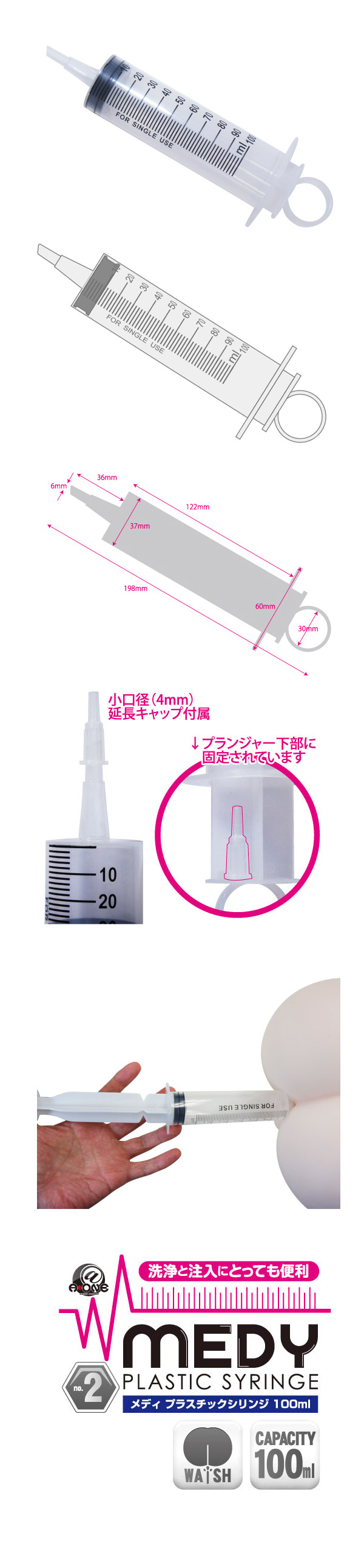 洗浄と注入にとっても便利なプラスチック製シリンジ「MEDY(メディ) no.2 プラスチックシリンジ 100ml」。 表面には目盛が付いているので注入量の調節にとっても便利で、押し手部分にリング状の取っ手が付いているので、片手でもしっかり操作することが可能。 さらに、直径4mmの小口径延長キャップが付いているので、初心者でも安心してご使用頂けます。 色々な用途に使えて扱いやすさも抜群の多機能シリンジです。