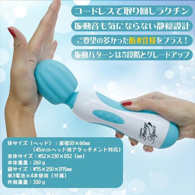 ハイパワーなバイブレーションはそのままに、今までご要望の多かった防水機能をプラス!更に振動パターンは5段階とグレードアップ!使用後は水でサッと洗えます。コードレスの電池式で場所を選ばずいつでもどこでも楽しめます。今までより更に静音化に成功しました。従来の45mmヘッド用のアタッチメントも装着できます。単3電池×4本使用(付属) ※付属の電池は動作確認用です。