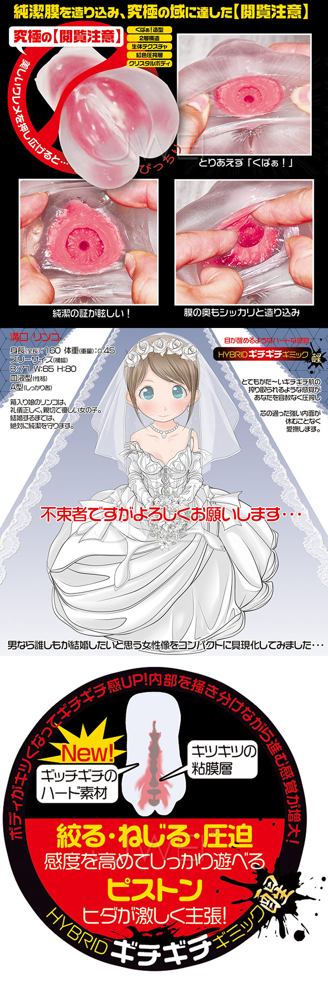 超刺激的につき中毒患者続出!! 純潔度MAXの人気シリーズ「ろりんこ」のハードバージョンで膜を突破する刺激もパワーアップ!! ギチギチの硬い素材で作られたホールで、エロチックなトルソー型のボディと、中が透けるクリアカラー素材だから、内部の赤く色付いたエロチックな構造が視覚興奮を誘います。 また、このシリーズの特徴ある3mmの純潔膜も建在し、突き破る感覚を最上級な形でお楽しみ頂けます。リアルに突き破る感触を実感出来る事でしょう。 キツキツの粘膜層とギッチギチのハード外部素材による超高圧力なハード刺激は、数回のピストン運動で射精しちゃうかも・・・。