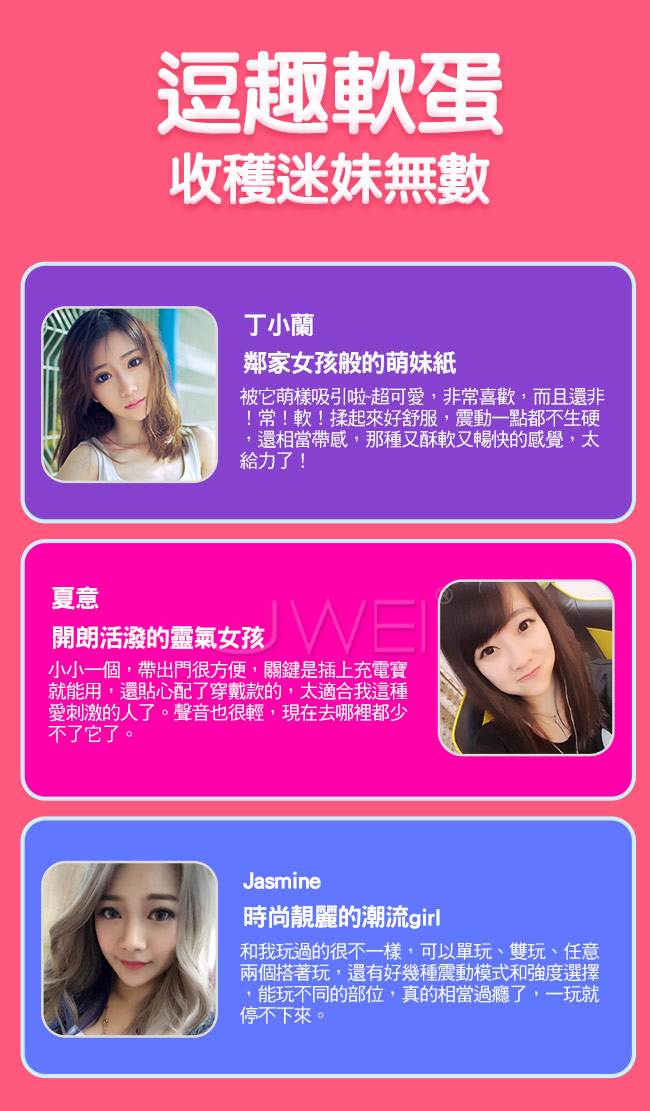 Q軟猛蛋採用異常柔軟擬膚質TPE,觸感彈滑溫潤,劃過身體敏感部位比暖男舌舔來舒爽,是軟妹子們的摯愛玩寵。採用的是高科技直充不需要等充滿電或換入電池才能使用,軟蛋不想讓您玩趣受線要您隨時、隨地、隨心快活行動電源隨身帶哪兒都是戰場喔~擁有雙頭線控設計,可雙蛋雙跳2個跳蛋同步震顫、挑逗不同慾望地帶快感豐富到您嬌喘連連喔~~