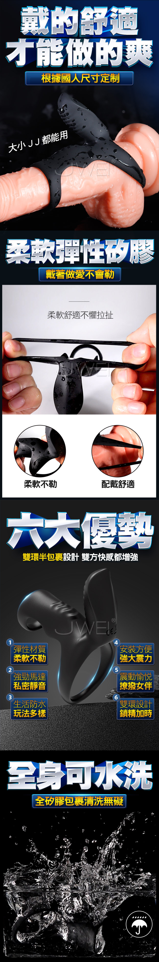 虎威震動鎖精環在持續運動中不斷愉悅女性敏感點,讓她都高潮了您還硬邦邦。大浪紋刺激拍打陰蒂U點嗨翻另一半,高頻率大馬達 震動強度看的見共震調情男女共爽。雙重束精鎖住老二鎖住陰囊用時間證明強悍。使用柔軟彈性矽膠戴著做愛不會勒柔軟舒適不懼拉扯。全矽膠包裹清洗無礙盡享魚水之歡唷~~~