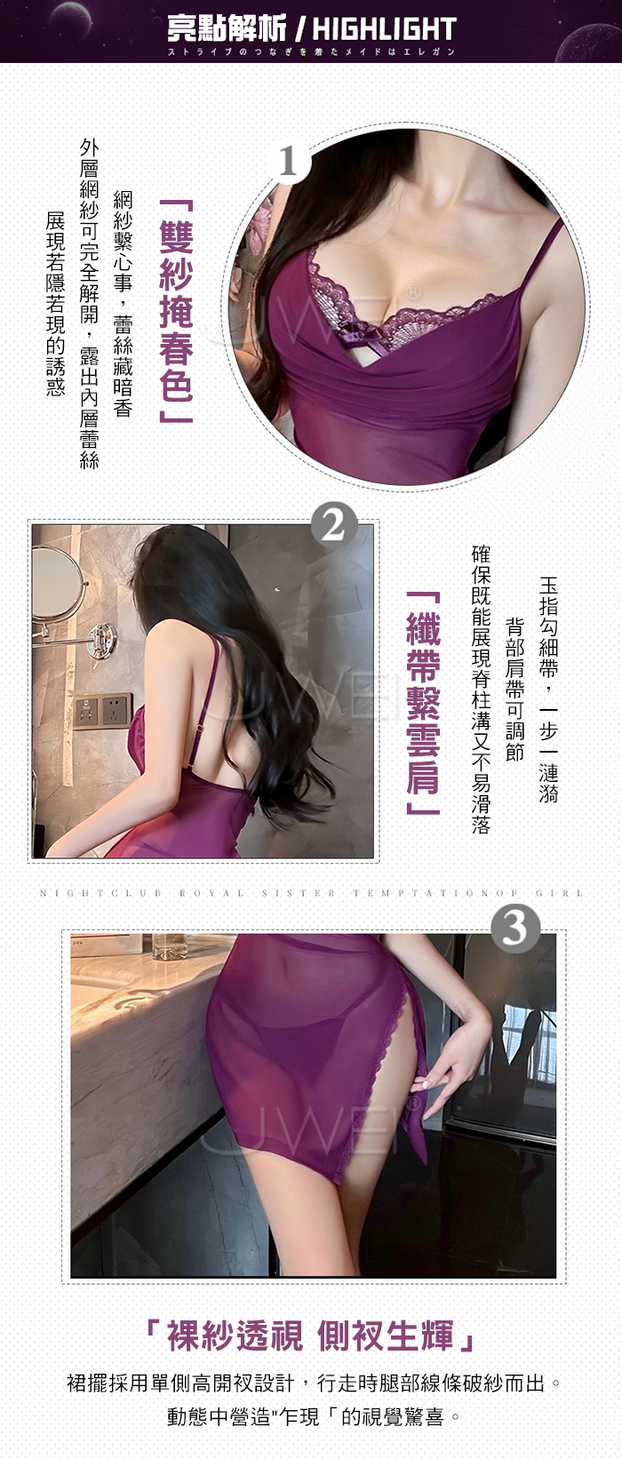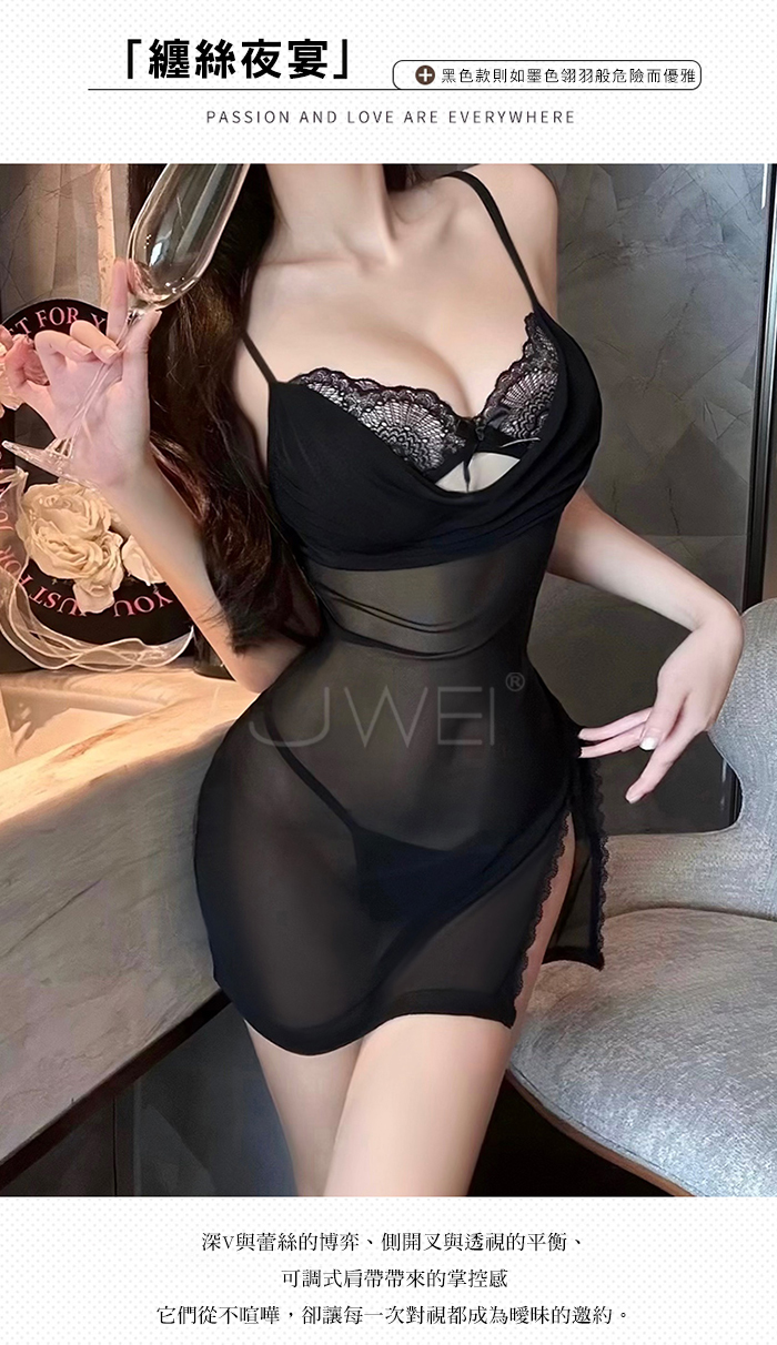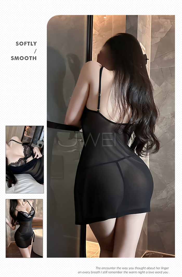 首頁 / 月暮迷紗.性感裸紗蕩領透視側開衩細肩帶美背睡裙【睡裙+T褲-黑色】