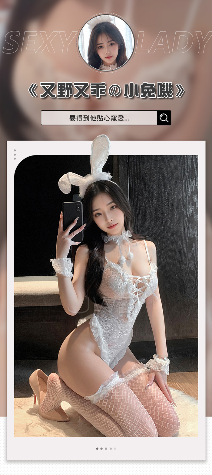 首頁 / 花蔓萌兔.深V綁帶露溝 萌兔蕾絲半透露背連體套裝-白色【兔耳髮箍+毛球頸環+連體衣+手環*2+白花邊網襪】