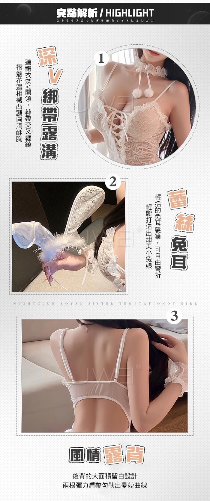 花蔓萌兔.深V綁帶露溝 萌兔蕾絲半透露背連體套裝-白色【兔耳髮箍+毛球頸環+連體衣+手環*2+白花邊網襪】
